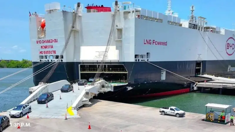 El BYD CHANGZHOU, un barco de la automotriz BYD diseñado para transporte ecológico, descargó su carga récord en la terminal portuaria. El hecho marca un nuevo paso en la expansión de marcas chinas en Argentina.