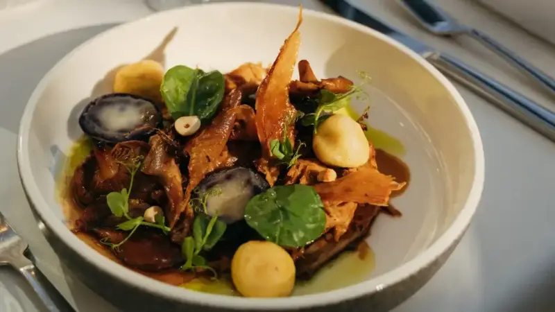 La velada comienza con un amuse-bouche de paté de foie con arándanos y masa crocante, seguido de entradas que destacan por su creatividad y técnica: salmón tricolor curado acompañado de ahucamolli cremoso y vegetales delicados, o confit de pato pekín con espuma de maíz dulce, vegetales pickle artesanales y polvo de hongos.