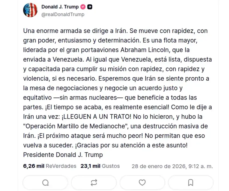 Irán intensificó su retórica contra Estados Unidos luego de que el presidente estadounidense, Donald Trump, amenazara con acciones militares en su contra y movilizara una fuerza naval significativa hacia la región del Golfo Pérsico, elevando la tensión en Medio Oriente.