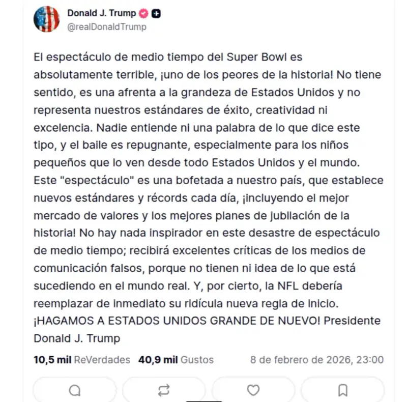 El mandatario utilizó su red social Truth Social para calificar la actuación del artista puertorriqueño como “absolutamente terrible, uno de los peores de la historia” y “una afrenta a la grandeza de Estados Unidos”. Según Trump, la presentación “no tiene sentido” y no representa “los estándares de éxito, creatividad o excelencia” del país, además de afirmar que “nadie entiende ni una palabra de lo que dice este tipo” y que el baile fue “repugnante, especialmente para los niños”.